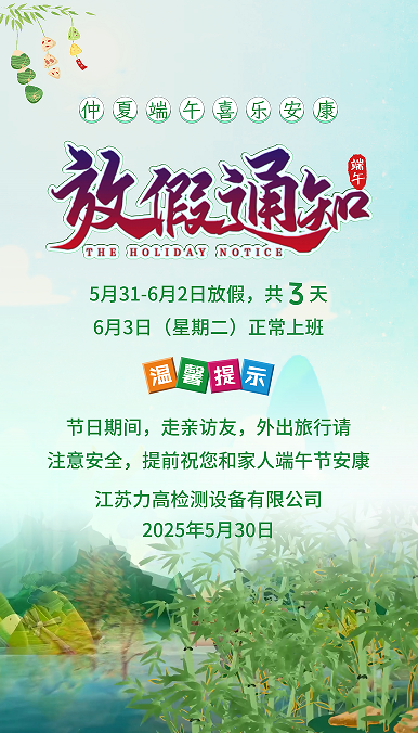 根據(jù)國務(wù)院辦公廳《關(guān)于2025年部分節(jié)假日安排的通知》精神,2025年端午節(jié)假期定為5月31日(周六)至6月2日(周一),共3天。本次放假無需調(diào)休,為企業(yè)員工與客戶提供了連貫的休息時(shí)間。值此傳統(tǒng)佳節(jié)之際,江蘇力高謹(jǐn)向全體員工及合作伙伴致以節(jié)日問候,并同步安排假期相關(guān)事項(xiàng),確保業(yè)務(wù)銜接與客戶服務(wù)不受影響。